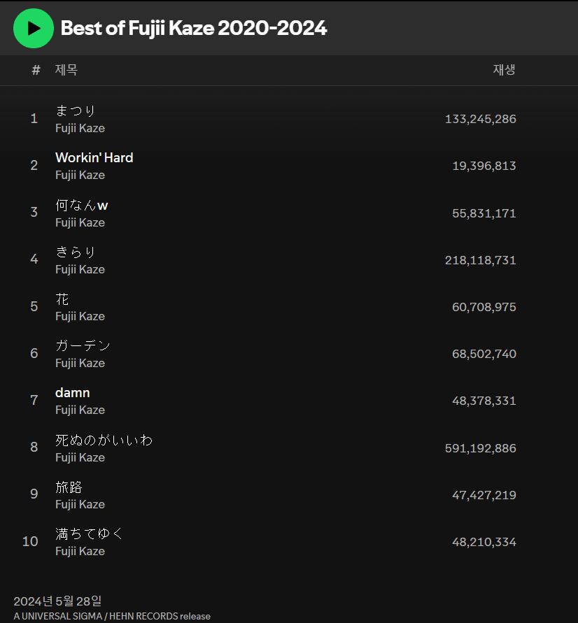 마츠리부터 하나, 카라리, 죽는게 나아까지 후지이 카제의 명곡들이 모두 포함되어 있는 모습이죠~?